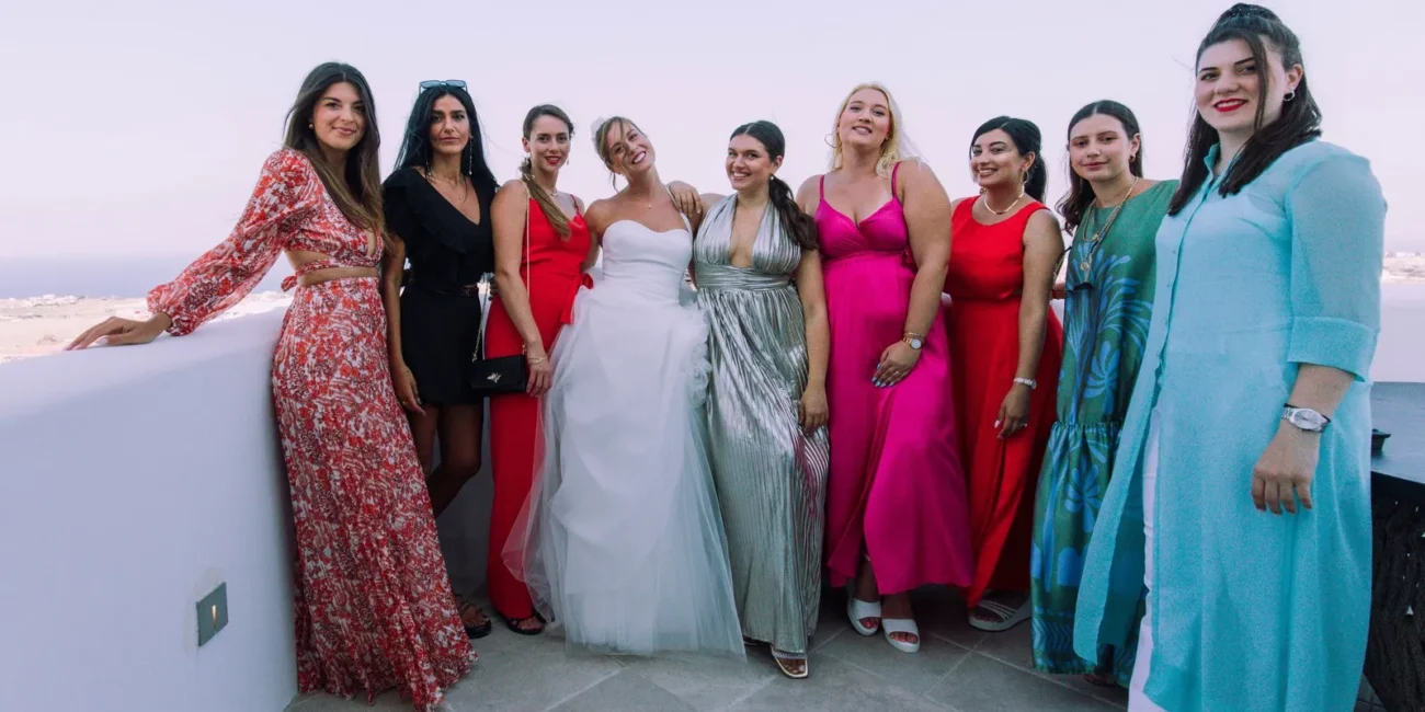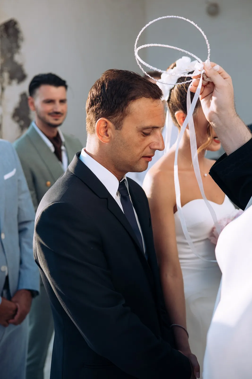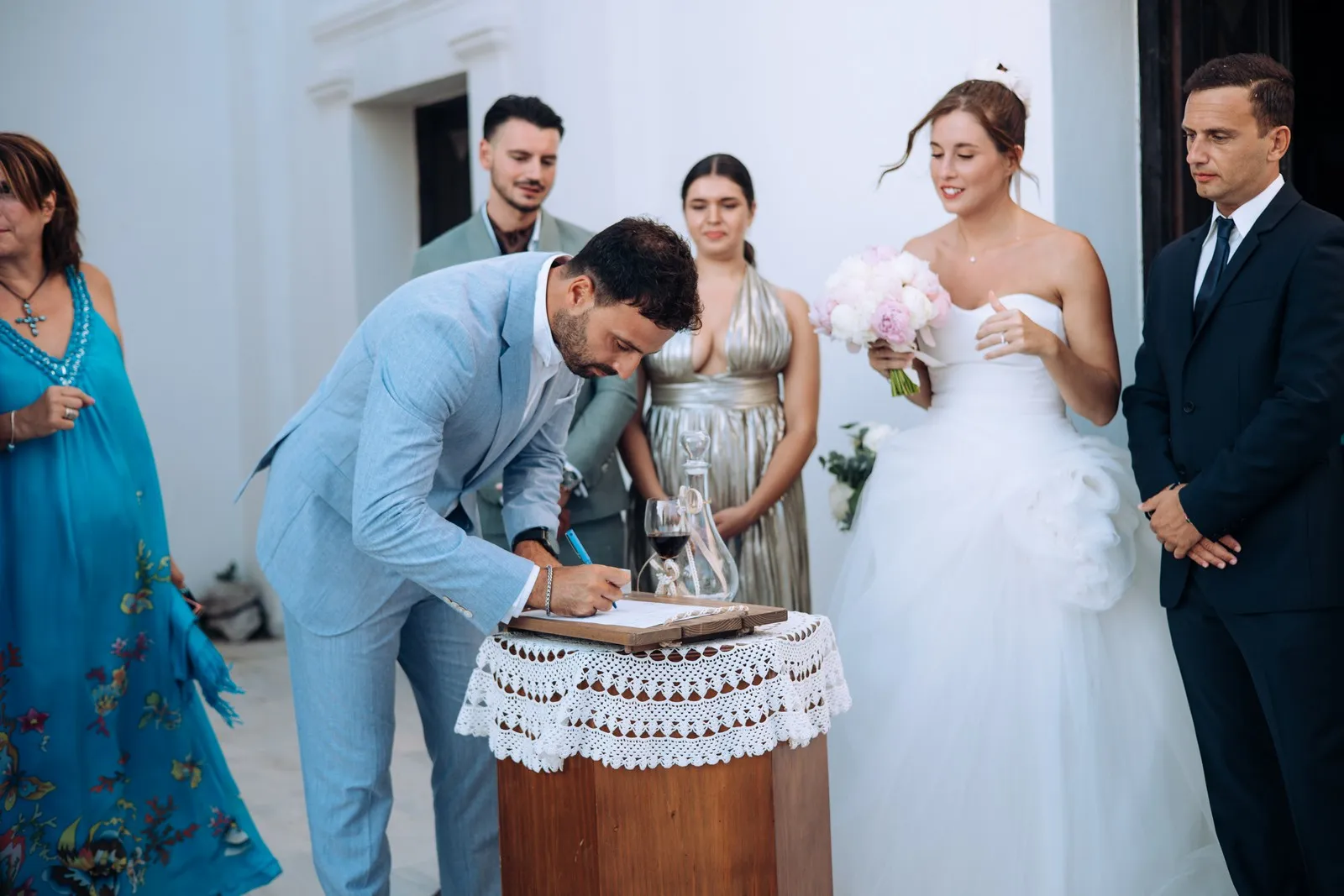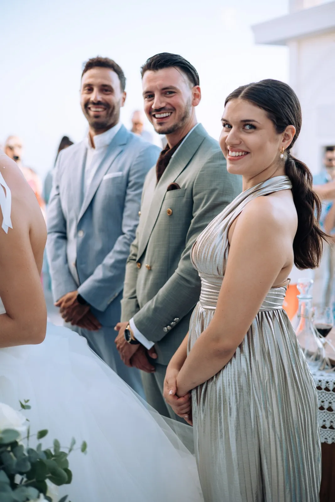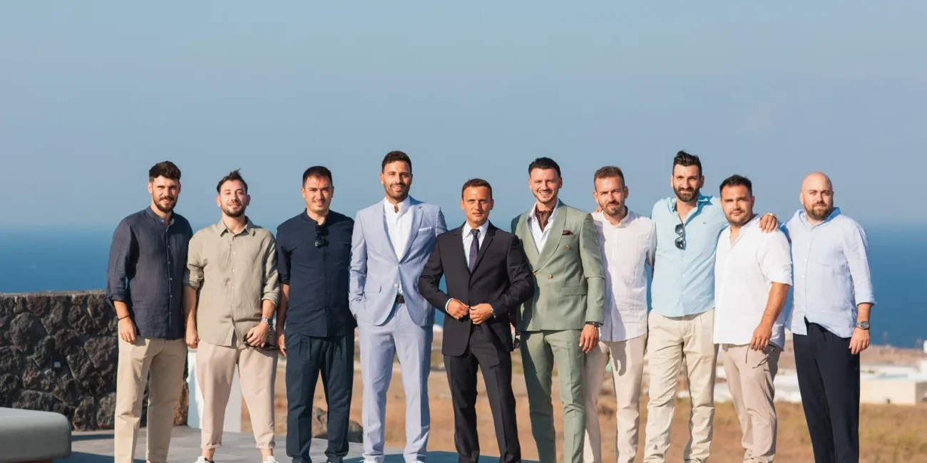 The day unfolded like a cinematic sequence. Inside the historic villa, Evgenia prepared in an atmosphere of soft light and quiet anticipation, every detail reflecting understated sophistication. Her look effortless yet striking perfectly echoed the setting. At the same time, Dario, alongside his closest friends, embraced the calm excitement of the day, sharing moments that felt genuine and unfiltered.