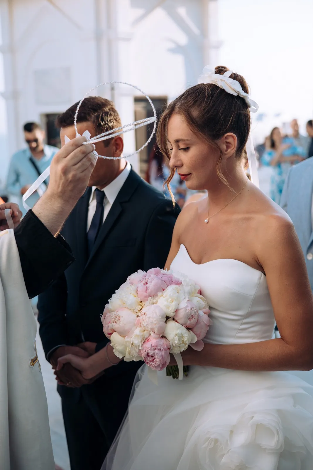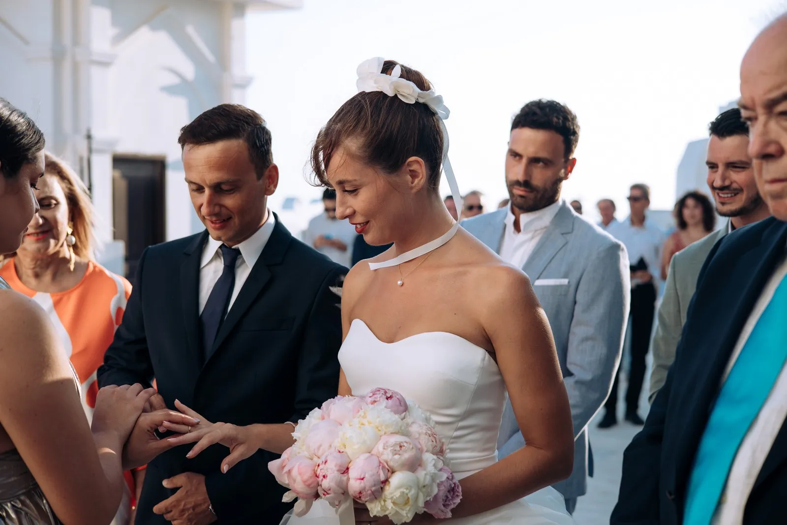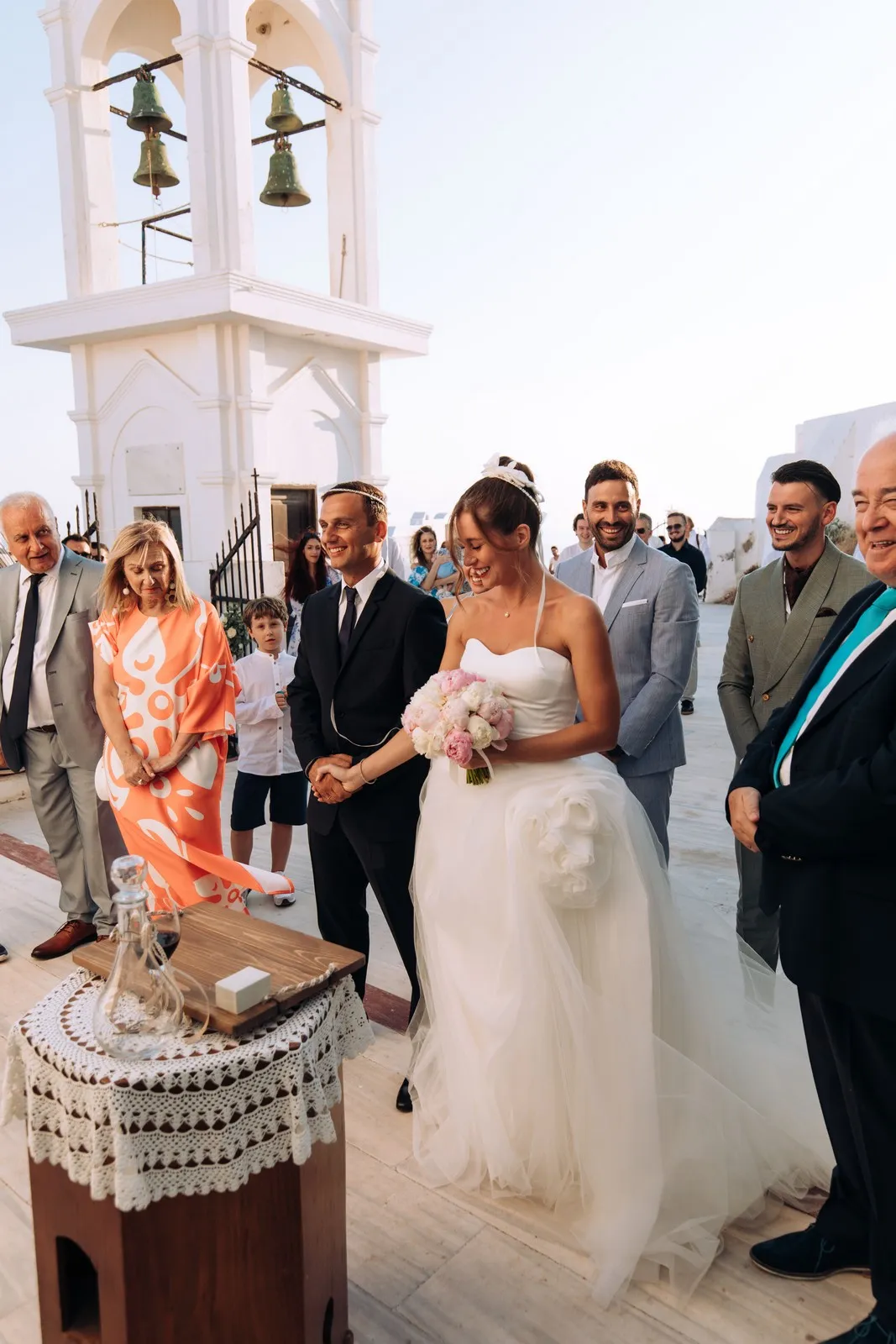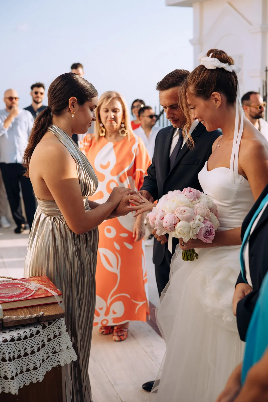 The day unfolded like a cinematic sequence. Inside the historic villa, Evgenia prepared in an atmosphere of soft light and quiet anticipation, every detail reflecting understated sophistication. Her look effortless yet striking perfectly echoed the setting. At the same time, Dario, alongside his closest friends, embraced the calm excitement of the day, sharing moments that felt genuine and unfiltered.